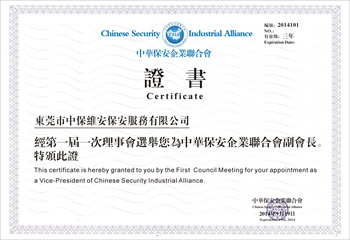 中華(huá)保安企業聯合會副會長(zhǎng)證書