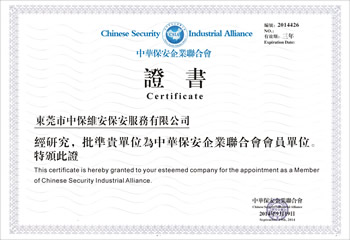 中華(huá)保安企業聯合會(huì)會(huì)員證書